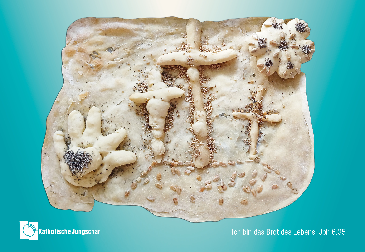 Das Osterfest ist der Höhepunkt im christlichen Jahreskreis. Mit der Ostergrußkarte möchte die Katholische Jungschar die Botschaft von der Auferstehung Jesu weitertragen. Bereits seit 1969 besteht der Brauch der Ostergrußkarte der Katholischen Jungschar. Das Bild, das von Jungscharkindern gestaltet wird, soll die Botschaft von der Auferstehung Jesu zu möglichst vielen Menschen bringen. Das heurige Bild kommt von Jungscharkindern aus der Pfarre Breitenfurt- St. Bonifaz aus Niederösterreich in der Erzdiözese Wien. Die Gruppen unterschiedlicher Altersstufen haben sich hierfür zusammengetan, um herauszufinden, was die Worte Jesu „Ich bin das Brot des Lebens“ [Johannes 6,35] für sie bedeuten könnten. Dabei ist aus Brotteig das Ostergrußmotiv entstanden.