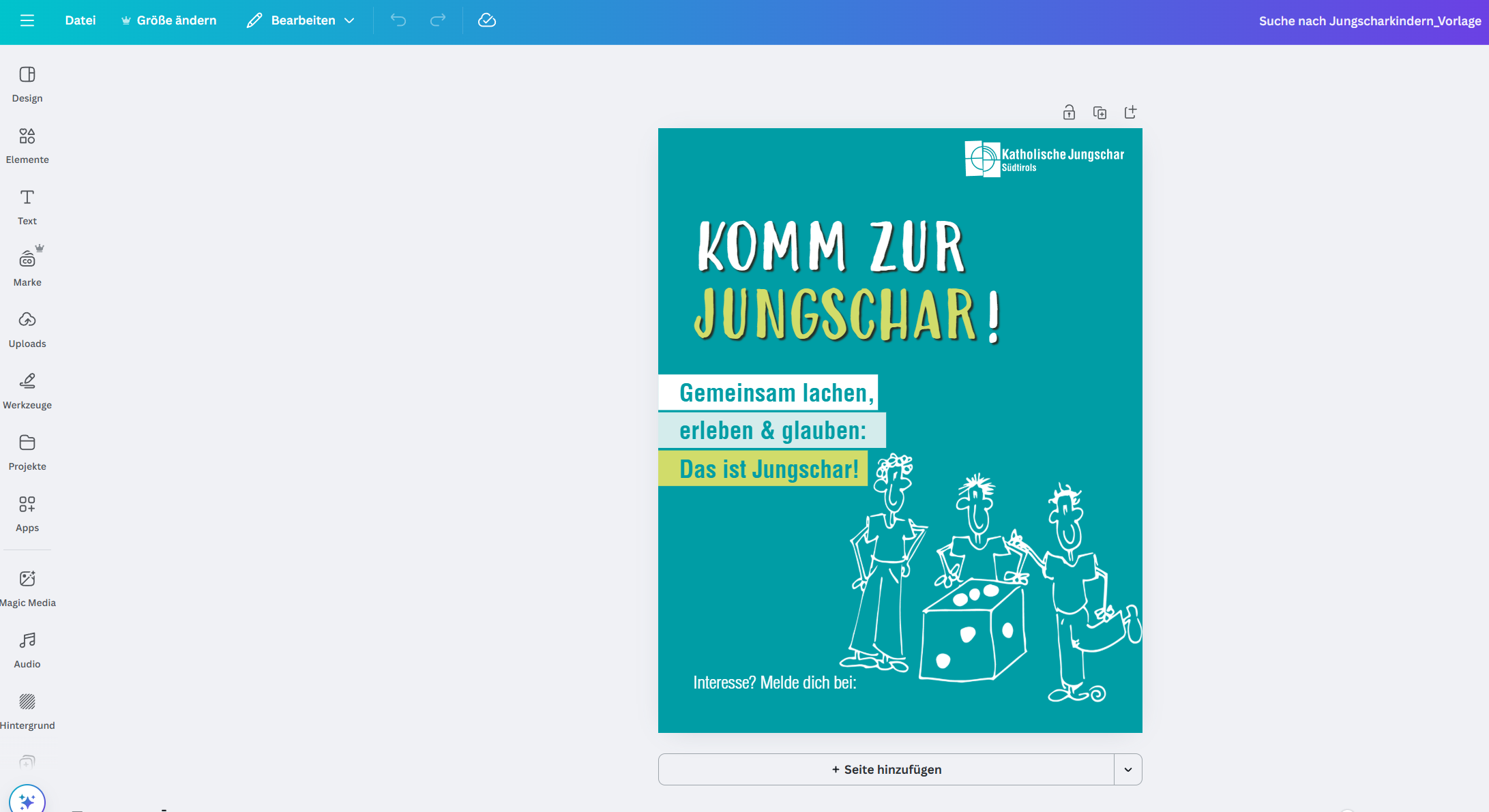 Du suchst nach Grafik-Vorlagen, um nach Minis, Gruppenleiter:innen oder Jungscharkindern zu suchen oder um euer Programm zu bewerben?