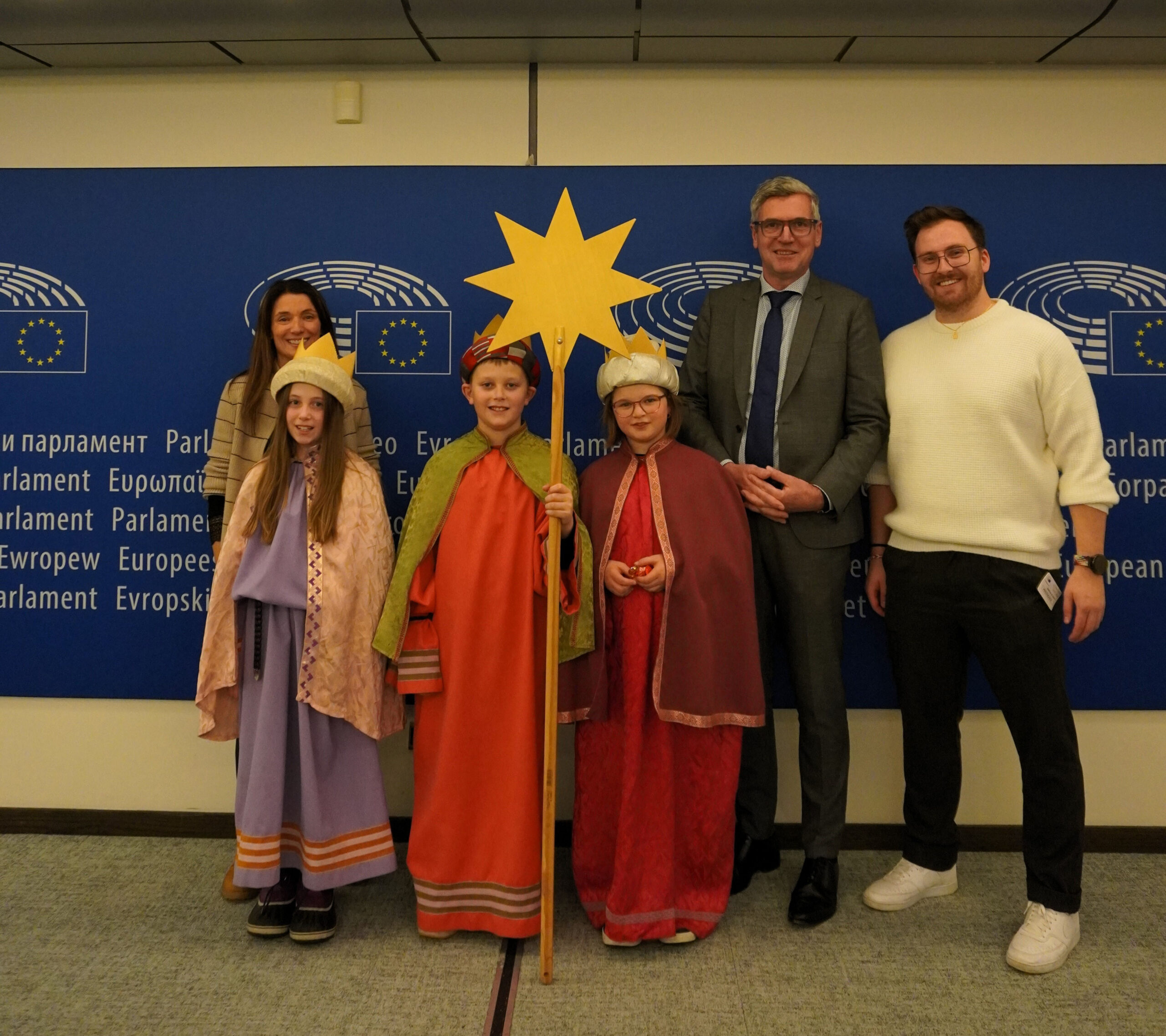 Feierlich zogen die Sternsinger:innen aus sechs Ländern mit Sternen und Kronen in das Europäische Parlament ein. Empfangen wurden sie von Sabine Verheyen, Vizepräsidentin des Europäischen Parlaments. Nach der Segensüberbringung machten die Kinder und Jugendlichen auf die Lebenssituation arbeitender Kinder in verschiedenen Ländern aufmerksam und präsentierten ihre Wünsche an die Europapolitik für einen stärkeren Einsatz gegen Kinderarbeit. Sabine Verheyen bedankte sich bei den Kindern und Jugendlichen und betonte: „Ihr bringt uns den Segen, den wir für unsere politische Arbeit sicherlich brauchen können. Vielen Dank für euer Engagement. Ihr strahlt Hoffnung, Zuversicht und Hilfsbereitschaft aus. Mit eurem Engagement zeigt ihr, wie wichtig es ist, sich füreinander einzusetzen, unabhängig von Herkunft, Sprache oder Religion. Die Aktion lädt auch zum Hinschauen ein und zum Verantwortung übernehmen. Und das habt ihr an uns Abgeordnete gerichtet, dass wir mit unseren Entscheidungen diese Verantwortung wahrnehmen, dass sich die Situation von Kindern verändert in aller Welt.“ Während des Empfangs begrüßte auch EU-Parlamentspräsidentin Roberta Metsola die Sternsinger:innen und bedankte sich ebenfalls für deren Einsatz. Im Anschluss segneten die Kinder und Jugendlichen die Büros der Abgeordneten ihres jeweiligen Heimatlandes. Die vier Kinder aus Niederrasen besuchten unter anderem den Südtiroler EU-Parlamentarier Herbert Dorfmann, der sich sehr über den Besuch aus Südtirol freute. Bereits im Vorfeld hatten die Sternsinger:innen aus sechs Nationen traditionell das Sekretariat der COMECE (Kommission der Bischofskonferenzen der Europäischen Gemeinschaft) besucht. Erstmals segneten sie zudem den Sitz der EU-Kommission in Brüssel, wo sie unter anderem vom stellvertretenden Generalsekretär Nils Behrndt empfangen wurden.
